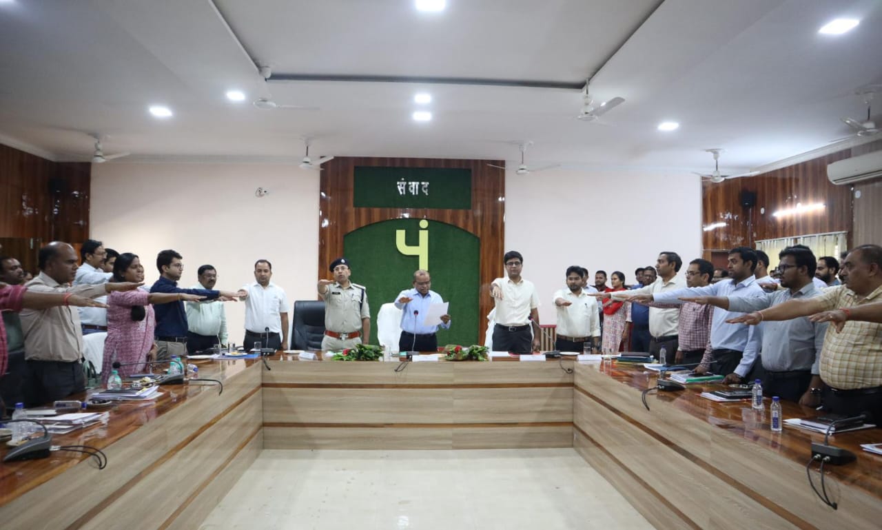समीक्षा बैठक में कमिश्नर श्री चुरेन्द्र ने अधिकारियों को लोकतांत्रिक परम्पराओं को रखने तथा स्वतंत्र, निष्पक्ष एवं शांतिपूर्ण निर्वाचन की गरिमा को अक्षुण्ण रखते हुए निर्भीक होकर, धर्म, वर्ग, जाति, समुदाय, भाषा अथवा अन्य किसी भी प्रलोभन से प्रभावित हुए बिना सभी निर्वाचनों में अपने मताधिकार का प्रयोग करने की शपथ दिलायी।