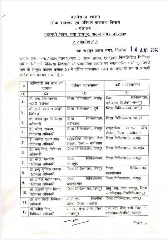 शायद यही वजह है कि जशपुर जिले को सरकार के द्वारा खाश तरजीह दी जा रही है ! पिछली सरकार के वक्त लगभग उपेक्षित सा पड़ा जशपुर जिला अब हर मामले में मजबूत होता जा रहा है ! जबसे जशपुर पुलिस फोर्स की कमान पुलिस अधीक्षक शशि मोहन सिंह जी ने सम्हाली है तब से जशपुर पुलिस के तात्कालिक कार्यवाहियों की सकारात्मक खबरें पढ़ने और देखने को मिलती ही रहतीं हैं ! अब जिस तरह सोसल मीडिया और समाचार माध्यमों में जिले की चिकित्सा विभाग की लापरवाहियों की पोल खोल हो रही थी उसे देखते हुए प्रदेश सरकार ने एक साथ जिले के कई डाॅक्टरों के तबादले कर दिए हैं और प्रदेश के दुसरे क्षेत्रों से विशेषज्ञ डॉक्टरों की पदस्थापना जशपुर जिले में कर दी है यानी पुलिस विभाग के बाद अब स्वास्थ्य विभाग भी चकाचक… बहरहाल आपलोंगो के ज्ञान चक्षुओं की वृद्धि के लिए तबादले की लिस्ट सेवा में हाजिर है