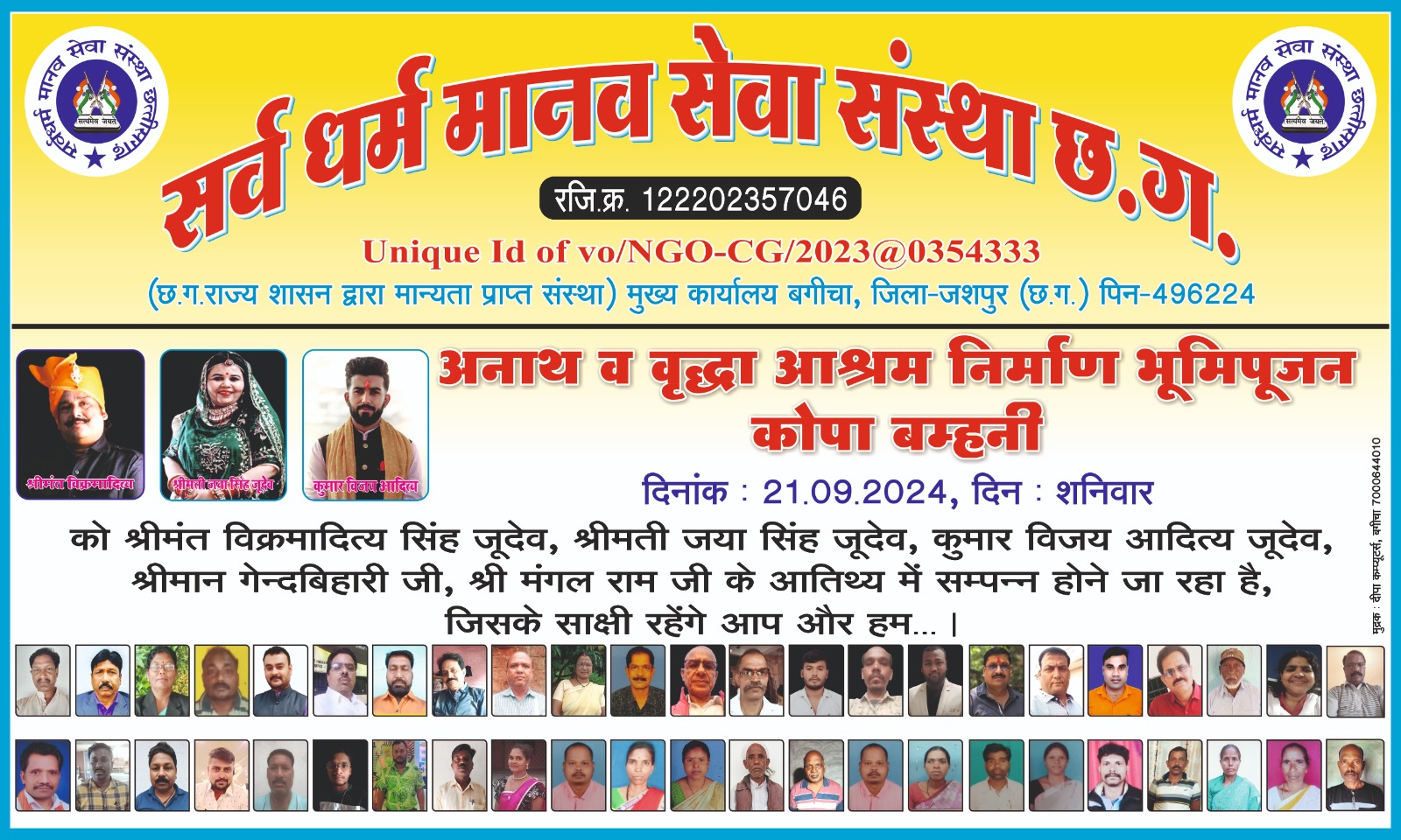 अनाथ व वृद्धा आश्रम निर्माण भुमि पूजन कार्यक्रम में मुख्य रूप से विशिष्ट अतिथि भाजपा के कद्दावर युवा नेता जिला पंचायत सदस्य श्री गेंद बिहारी जी, जनपद पंचायत सदस्य बगीचा श्री मंगल राम भगत जी मुख्य रूप से उपस्थित रहे साथ ही कार्यक्रम के सफल आयोजन में सर्व धर्म मानव सेवा संस्था छग की प्रदेश सचिव दयामनी एक्का, सर्व धर्म मानव सेवा संस्था छग सदस्य अलका मिंज, सूनील, जब्बार अंसारी, रमेश राम एवं सर्व धर्म मानव सेवा संस्था छग के बिलासपुर के युवा सदस्यों एवं पदाधिकारियों का सराहनीय योगदान रहा !