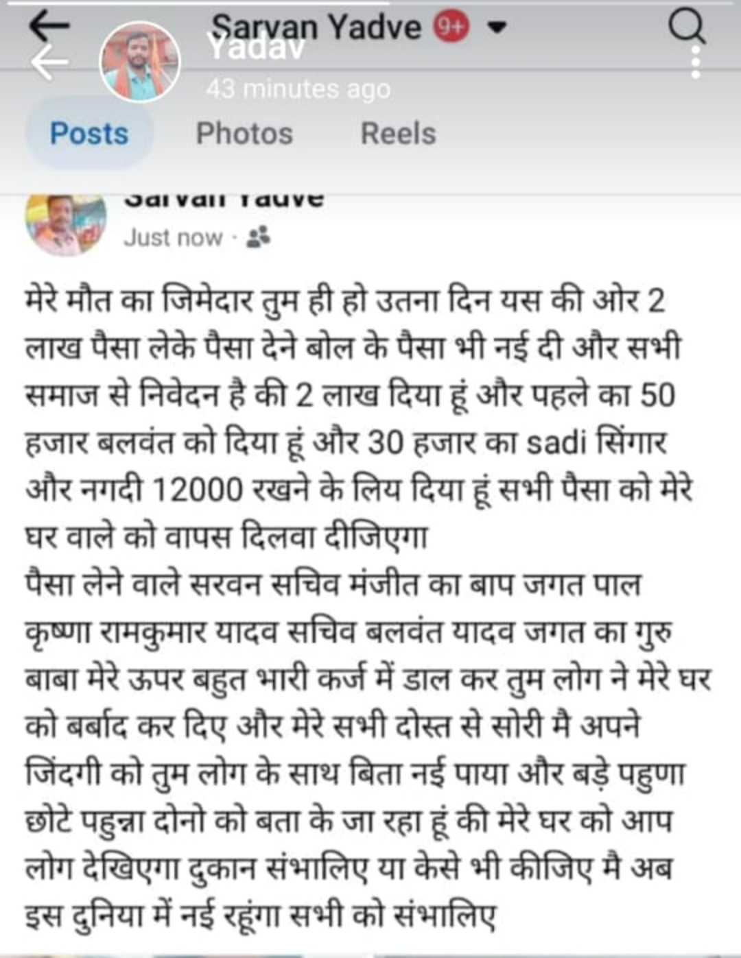 घर से निकलने के लगभग आधे घंटे के बाद, समय 9:13 मिनट में अपने फेसबुक अकाउंट पर पोस्ट डालता है जिसमें उक्त विवाहिता के साथ खिचाएं गए कुछ अंतरंग तस्वीरों को साझा करते हुए अपने अंतर्मन में चल रहे द्वंद्वों को लिखता है कि उस विवाहिता के लिए उसने क्या किया और समाज के दबंगों के द्वारा उसे कैसे आर्थिक और मानसिक रूप से प्रताड़ित किया जाता रहा है ! अपनी मौत का जिम्मेदार वह समाज के उन दबंगो को लिखता है साथ ही अपने बहनोइयों को परिवार की जिम्मेदारी लेने संबंधित निवेदन करते हुए सम्हालने की बात लिखकर दोस्तों मित्रों से साथ ज़िन्दगी न जी पाने की माफी मांगता है !