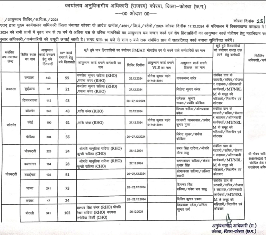 ????छ ग शासन स्कूल शिक्षा विभाग द्वारा बाकायदा आदेश जारी कर प्रदेश के समस्त शासकीय स्कूलों मे 23/12/2024से 28/12/2024 तक तक शीतकालीन अवकाश घोषित किया गया है जिससे स्कूलों मे अध्ययनरत विद्यार्थियों एवं शिक्षक अवकाश पर है, हप्ते भर का अवकाश होने के कारण कई शिक्षक मुख्यालय से बाहर प्रवास पर भी हैँ उक्त अवधि मे विकास खंड करतला मे कार्यरत शिक्षकों को आयुष्मान कार्ड बनाने राजस्व अधिकारी SDM कोरबा के द्वारा 26 एवं 27 दिसंबर 2024को पंचायतों मे ड्यूटी लगाई गई है जो पूर्णतः अब्यवहारिक है। शिक्षकों की गैर शिक्षकीय कार्यों मे ड्यूटी लगाए जाने पर शिक्षक संगठनों द्वारा पूर्व मे भी विरोध प्रकट किए जाते रहे हैँ किन्तु विभागीय प्रशासन पर इससे कोई सरोकार प्रतीत नही होता जिससे शिक्षक मानसिक कुंठा का शिकार होते हैँ छत्तीसगढ़ प्रदेश संयुक्त शिक्षक संघ के कार्यकारी प्रान्ताध्यक्ष ओमप्रकाश बघेल,संभागीय अध्यक्ष मोहन लहरी व छ ग शिक्षक संघ संभाग बिलासपुर के संभागीय अध्यक्ष तरुण सिंह राठौर एवं छ ग कर्मचारी अधिकारी फ़ेडरेशन जिला कोरबा द्वारा शासन द्वारा घोषित अवकाश अवधि मे शिक्षकों की ड्यूटी लगाए जाने का विरोध करते हुए जिला प्रशासन कोरबा से मांग की गई है की शीतकालीन अवकाश मे कई शिक्षक छुट्टी बिताने मुख्यालय से बाहर होने के कारण कार्य प्रभावित होंगे अतः शिक्षकों की ड्यूटी आयुष्मान कार्ड बनाने मे लगाई गई है उसे निरस्त कर शीतकालीन अवकाश के बाद शिक्षकों की सेवा लिए जाएँ ताकि शिक्षक पूर्ण मनोयोग से कार्य कर सकें ।