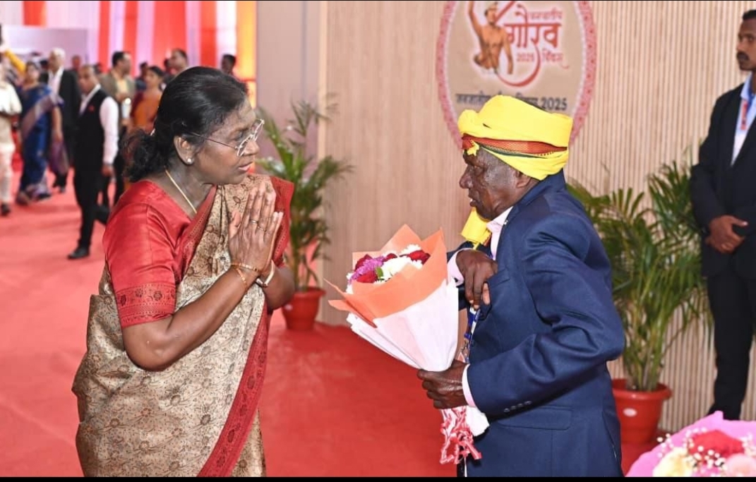✍️ जनजातीय गौरव दिवस के राज्य स्तरीय कार्यक्रम में गुरुवार को एक ऐतिहासिक और भावुक क्षण देखने को मिला, जब राष्ट्रपति श्रीमती द्रौपदी मुर्मु ने पण्डो जनजाति के वरिष्ठ सदस्य बसन्त पण्डो से विशेष मुलाकात की। कार्यक्रम स्थल पर जब बसन्त पण्डो राष्ट्रपति मंच के समीप पहुँचे, तो राष्ट्रपति मुर्मु ने अत्यंत आत्मीयता के साथ उनका कुशल-क्षेम जाना, उन्हें पास बुलाया और स्नेहपूर्वक शॉल ओढ़ाकर सम्मानित किया।